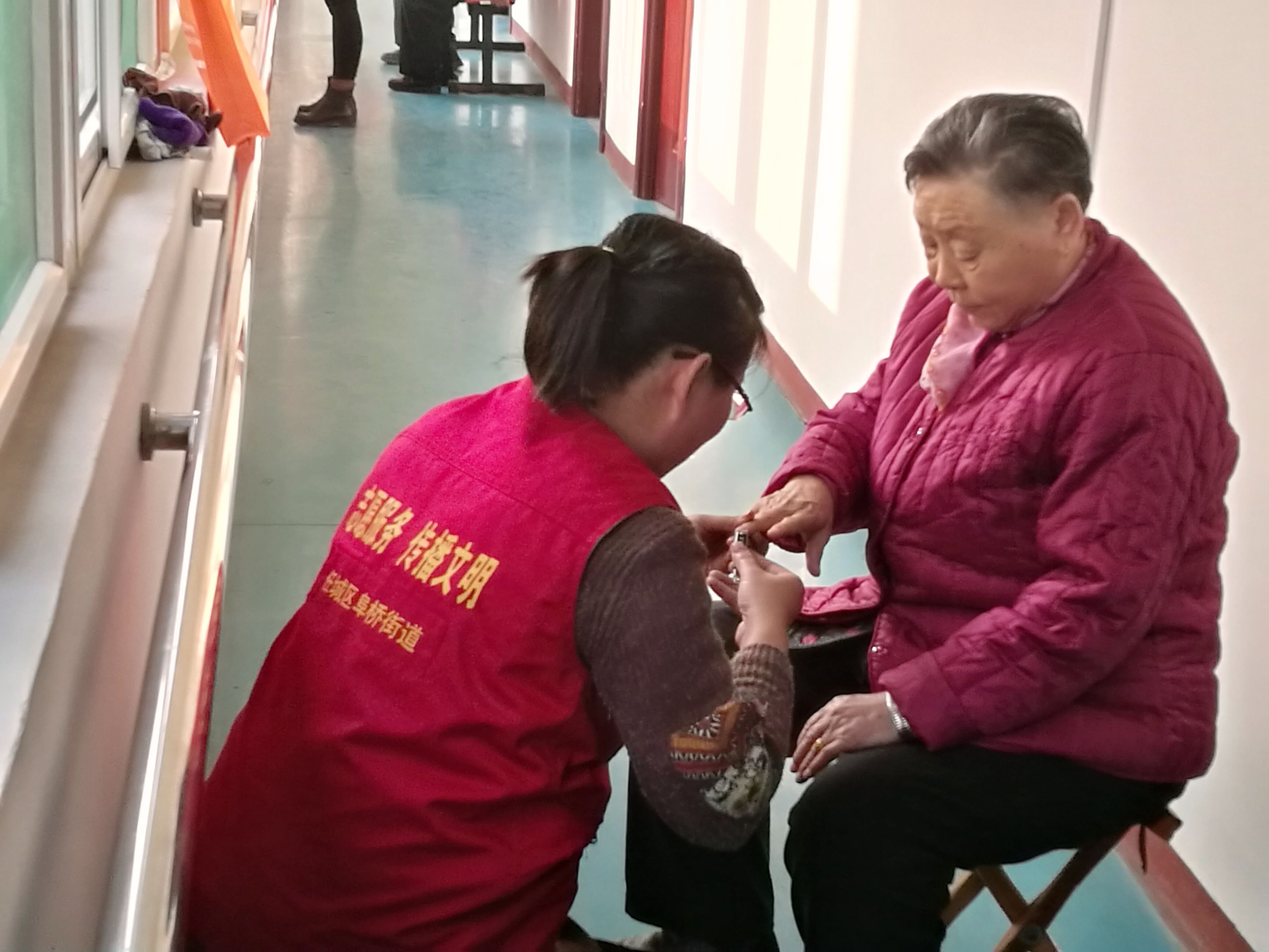 这边社区志愿者忙活着打扫卫生,那边社区志愿者开始给老人剪剪指甲,不少老人搬着马扎坐到走廊里,和社区志愿者们聊的非常开心。