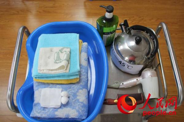 1.需要准备的物品:洗脸毛巾、浴巾、别针、洗发液,纱布或眼罩、棉球、水壶、40℃~45℃的温水、塑料布(橡胶单)、水桶、橡胶马蹄形垫(可自制)、梳子、电吹风机。