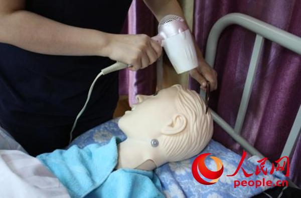 用电吹风机吹干老年人头发。(“达医晓护”供图)